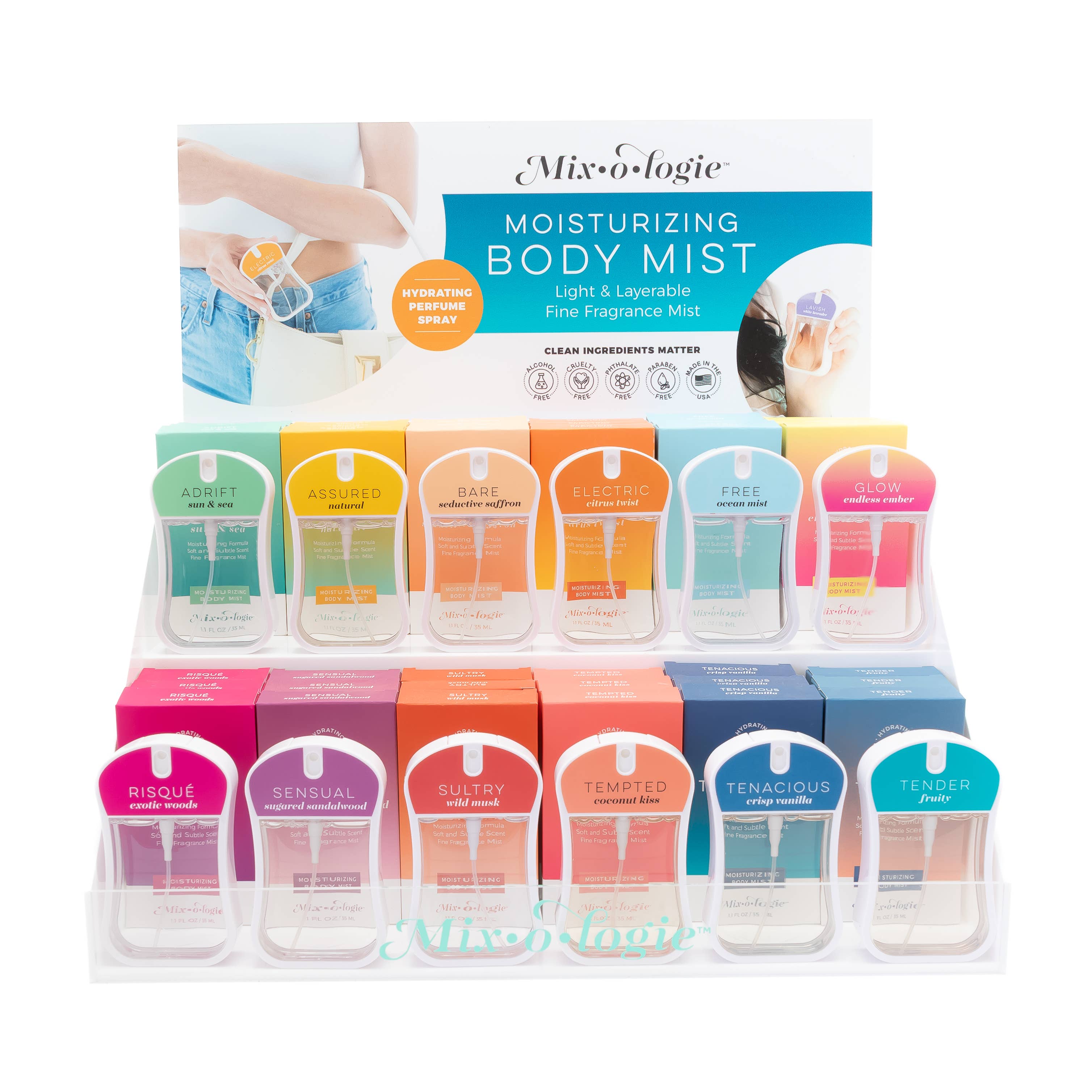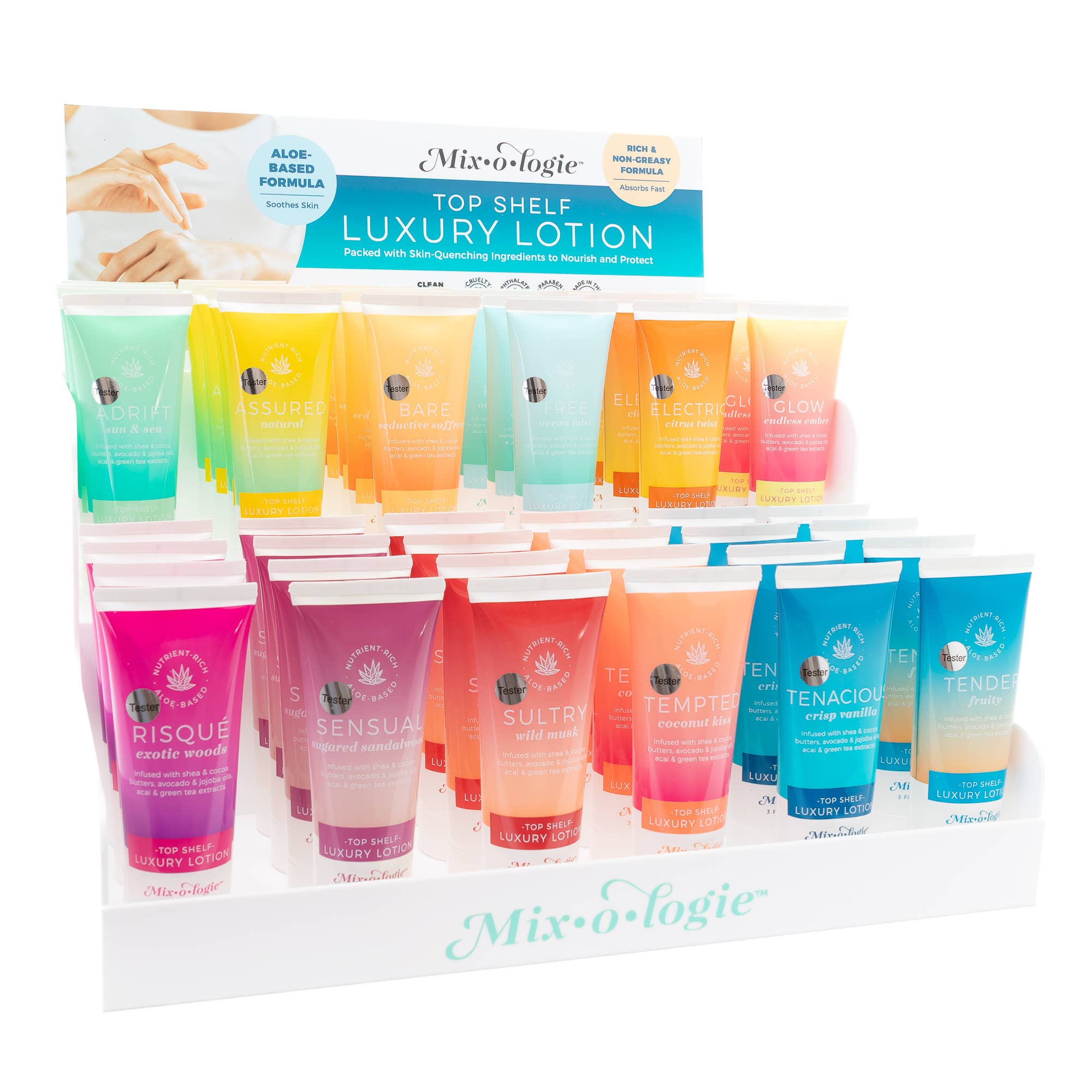 Prêt-à-vendre Pré-emballé Comprend : 36 Lotions (3 de chaque parfum x 12 parfums) Il est temps de faire des soins de la peau une priorité avec une hydratation profonde et nourrissante qui protégera et chouchoutera votre peau toute la journée. Infusée d'un mélange luxueux de beurre de karité, beurre de cacao, huile de coco, lait de chèvre, huile d'avocat et huile de graines de jojoba, cette formule riche et désaltérante pour la peau offre une hydratation intense et une douceur durable, laissant votre peau veloutée – parfaite pour votre rituel quotidien de soins de la peau. Elle fait également office de crème pour les mains ultra-hydratante qui laisse vos mains aussi choyées que le reste de votre corps. Parfums dans le Pré-emballé : Adrift (soleil & mer) Assured (naturel) Bare (safran séduisant) Electric (twist d'agrumes) Free (brume océanique) Glow (braise infinie) Risque' (bois exotiques) Sensual (bois de santal sucré) Sultry (musc sauvage) Tempted (baiser de coco) Tenacious (vanille croquante) Tender (fruité) + Testeurs *Disponible avec ou sans présentoir