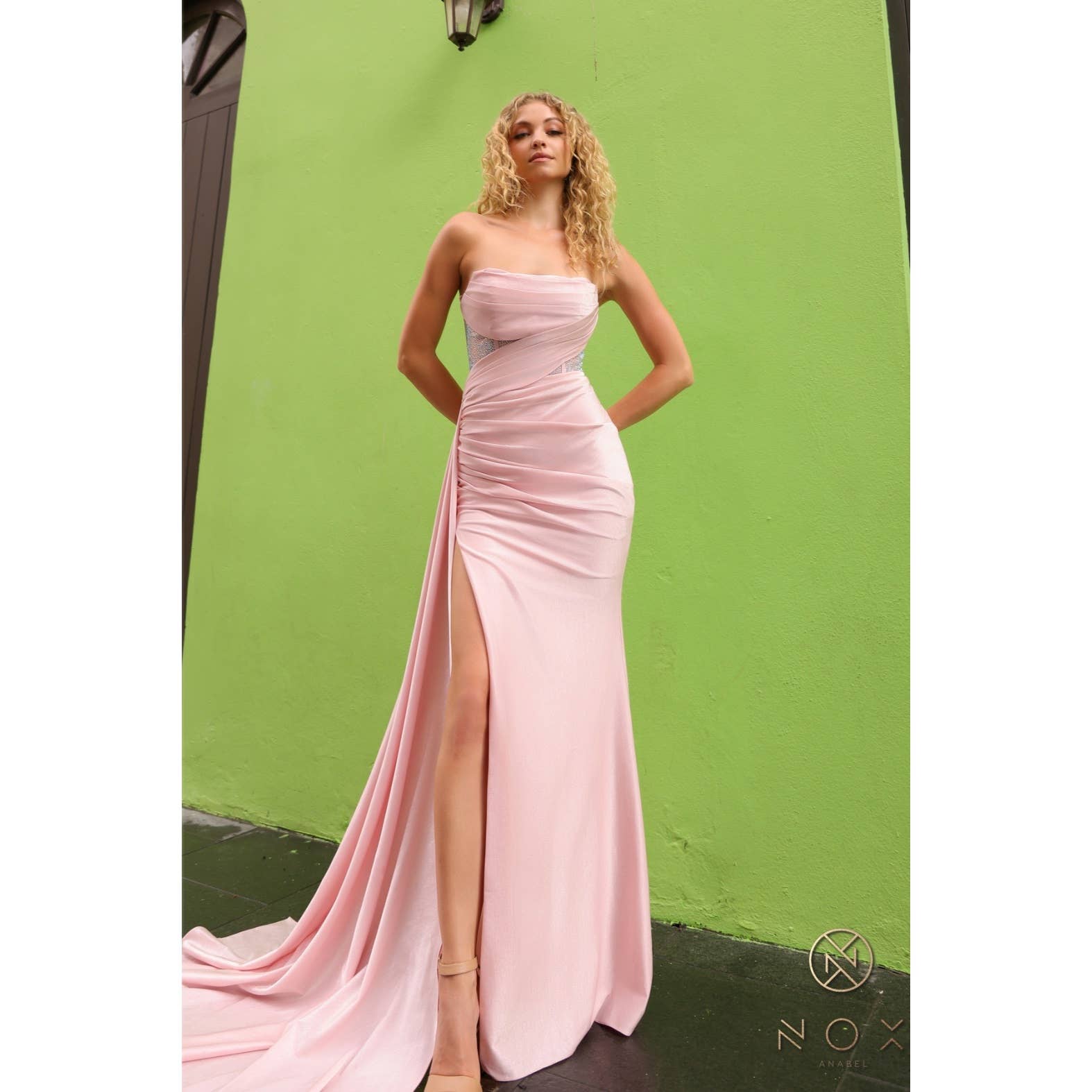 Robe en satin avec décolleté en V, corsage croisé, bretelles spaghetti et fente haute pour bal de promo.