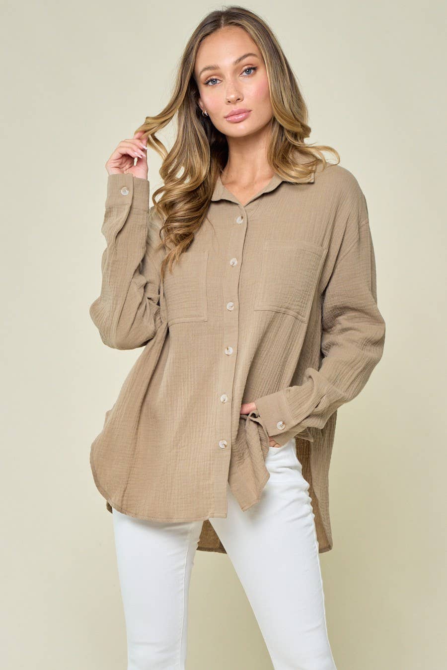 CHEMISE EN GAZE DE COTON AVEC DÉTAILS BORDS BRUTS - BOUTONS FONCTIONNELS - POCHES LATÉRALES 100% COTON *Pas de retours ni d'échanges* * En raison de l'éclairage et des différences entre les écrans, les couleurs réelles peuvent légèrement varier par rapport à ce qui apparaît en ligne.