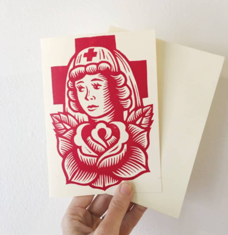 Gravure en linoléum du chat porte-bonheur Maneki Neko. Imprimée en typographie sur une carte postale en carton rigide de 12,7 x 17,8 cm (5 x 7 pouces).