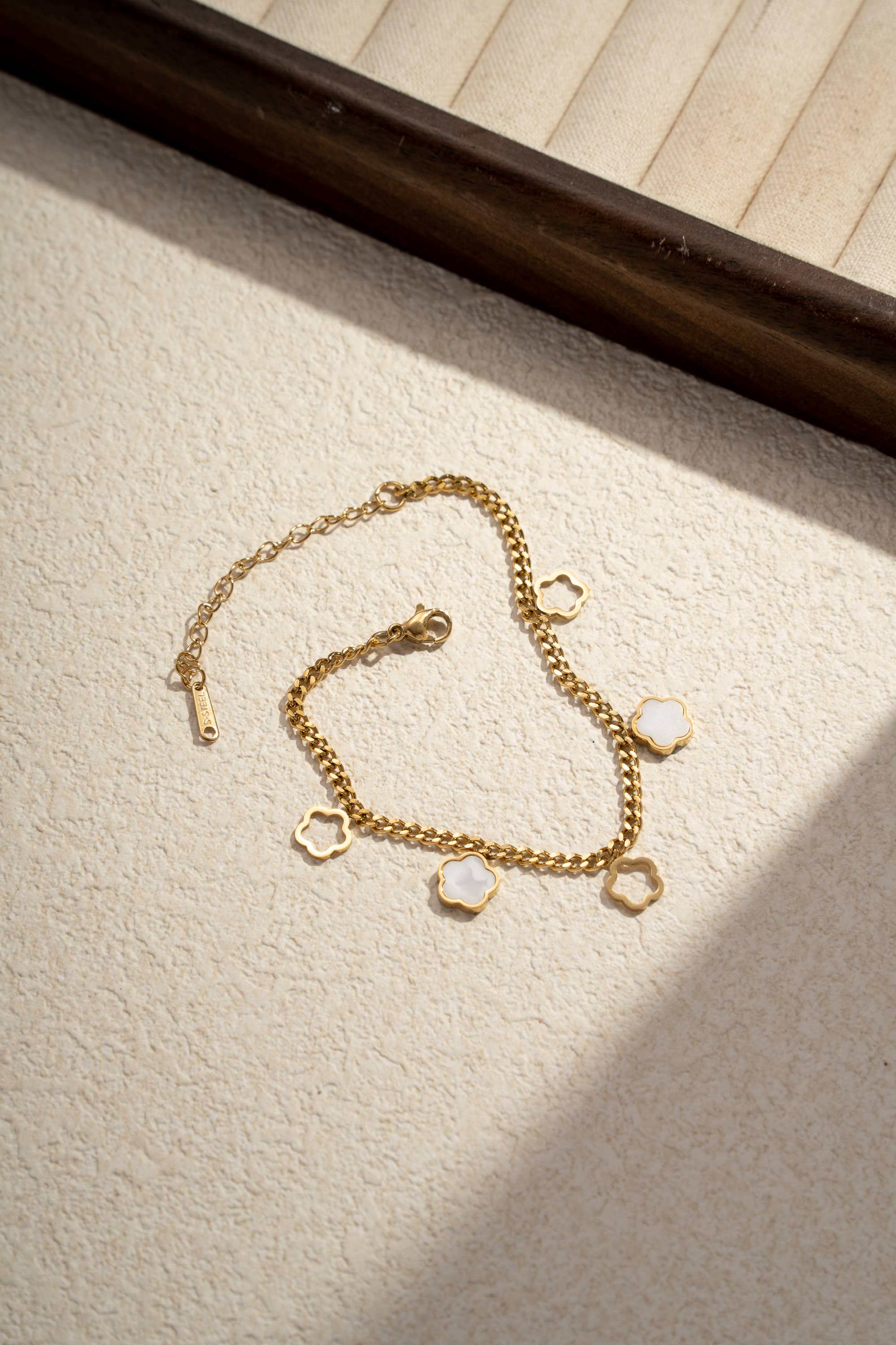Ce bracelet en acier inoxydable doré mêle charme et délicatesse avec ses trèfles à quatre feuilles et cristaux lumineux. Sa chaîne fine et ajustable épouse le poignet avec grâce. Résistant à l’eau, hypoallergénique et intemporel, il incarne la chance et l’élégance. Un bijou porte-bonheur à porter seul ou en accumulation pour un effet raffiné. En Acier Inoxydable, Sans Nickel, sans Cadmium et sans Sel de Plomb
