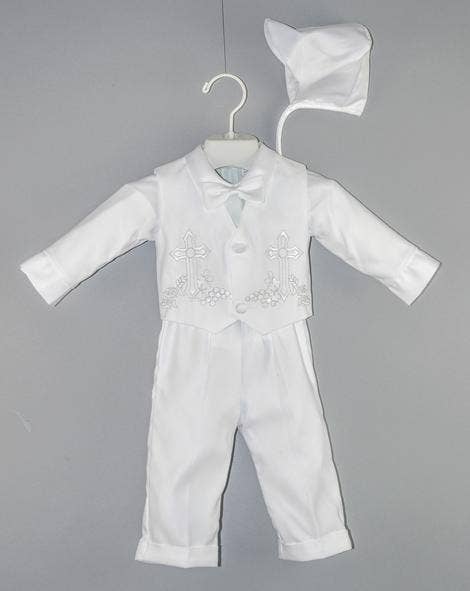 Robe de baptême en organza brodée de croix, avec un haut à manches en satin. Livrée avec un bonnet assorti. Parfaite pour : baptêmes, communions, Noël. Référence : Style n°470