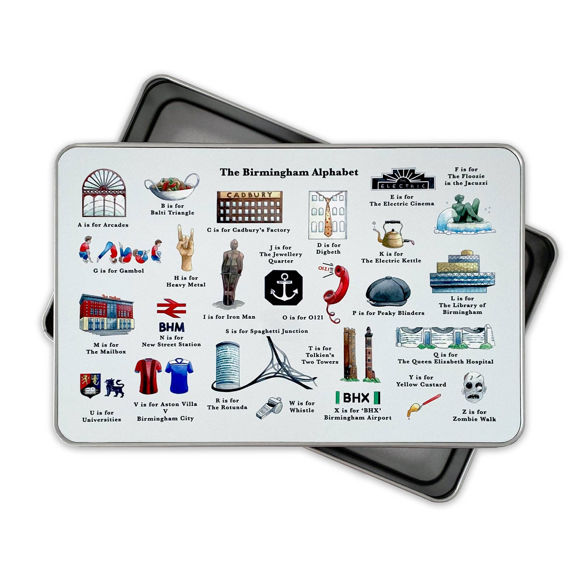 Ce torchon coloré « Alphabet de Birmingham » est le cadeau de départ idéal pour tous ceux qui partent ou déménagent à Birmingham au Royaume-Uni. C'est le cadeau parfait pour une pendaison de crémaillère à Birmingham ou un cadeau de retraite pour un employé de Birmingham. Ce torchon en coton de qualité supérieure comprend 26 illustrations colorées des bâtiments de Birmingham, ainsi que des monuments célèbres, des dictons de Birmingham, de la nourriture et des inventions de Birmingham. Ce beau design est fièrement produit au Royaume-Uni et est imprimé sur un coton de qualité supérieure. Le coton utilisé est fabriqué à partir d'un demi-panama de haute qualité de 8 oz, ce qui donne un design aux couleurs vives et aux détails fantastiques qui durent. La serviette mesure environ 68 x 45 cm et est ourlée sur les 4 côtés et comprend un crochet pour l'accrocher. Le torchon peut être lavé à 30° et possède une excellente résistance au lavage.