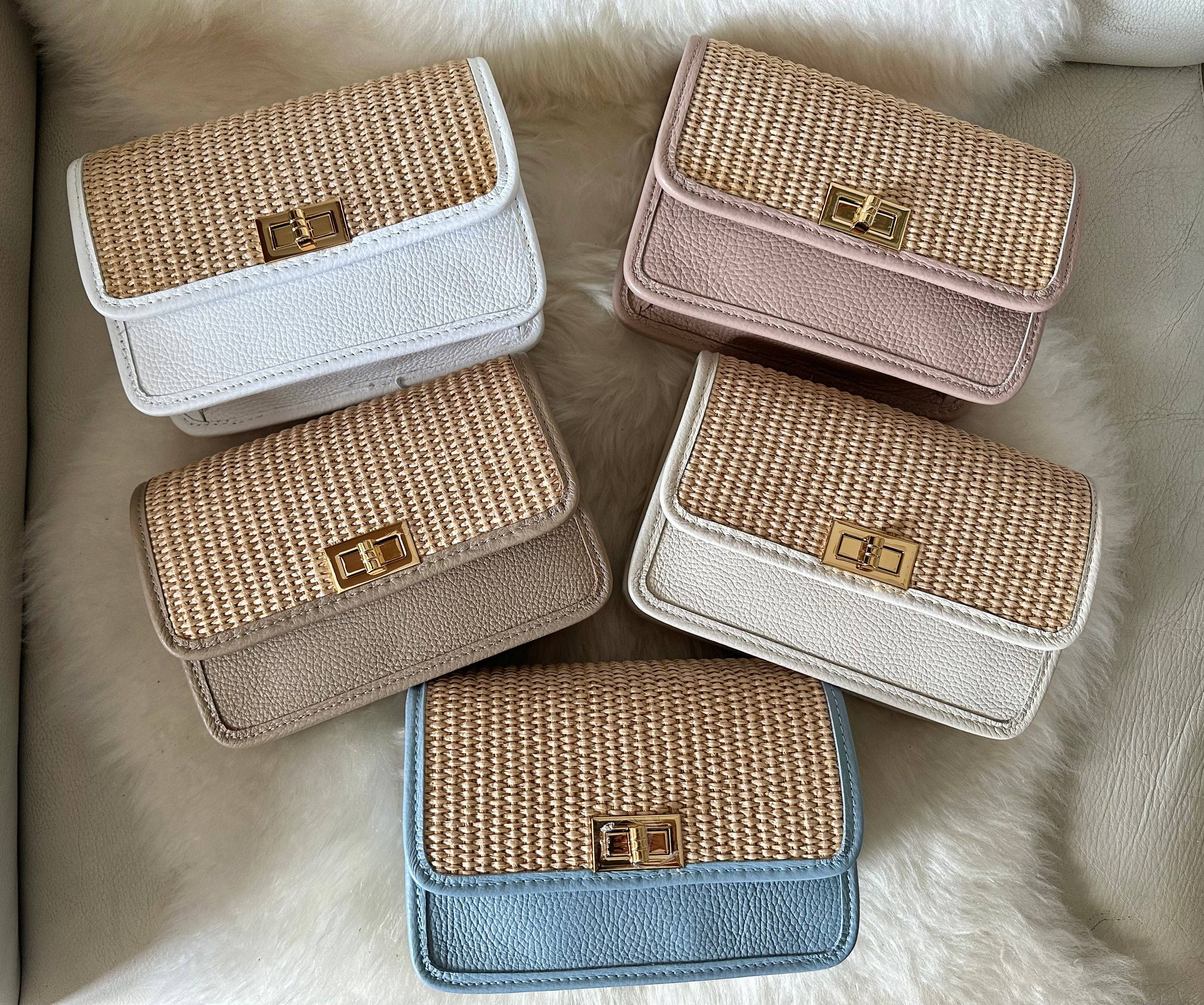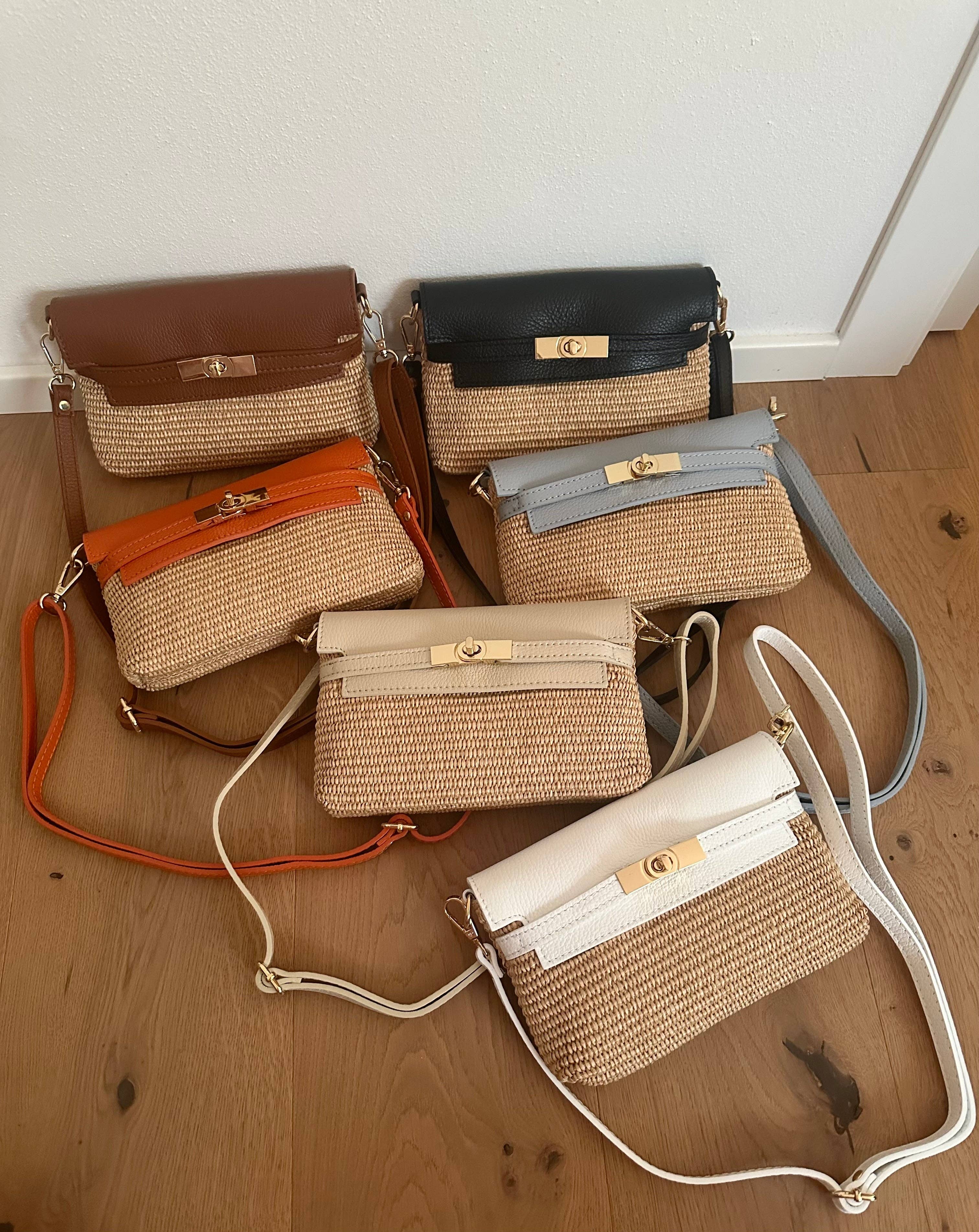 Sac en raphia et cuir véritable, fabriqué en Italie. Petit mais polyvalent, entièrement fait à la main avec du cuir italien de haute qualité. • Double bandoulière : une sangle en cuir pour porter à la main, et une chaîne pour porter à l’épaule ou en travers du corps. Fermeture en bambou. Convient parfaitement pour un téléphone et les essentiels lors de soirées ou événements, ainsi que pour un look plus décontracté au quotidien. 👜 Dimensions : Hauteur 13 cm, Longueur 19 cm.