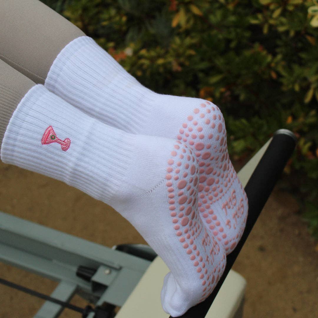 Nos chaussettes classiques à prise nervurée sont parfaites pour le Pilates, le Yoga, le Barre et les entraînements Lagree, offrant le bon mélange de flexibilité et de soutien. Nos chaussettes sont fabriquées à partir de matériaux de haute qualité conçus pour durer et offrir un confort tout au long de votre entraînement. DÉTAILS : * Chaussettes nervurées blanches * Longueur mi-mollet * Voûte plantaire ajustée et soutenante * Logo brodé sur chaque chaussette * Semelles antidérapantes marron * Tissu en mélange de coton * Taille unique INSTRUCTIONS D'ENTRETIEN : Laver en machine à froid, avec des couleurs similaires et retourner les chaussettes pour protéger les grips. Pour prolonger la durée de vie de vos chaussettes, laissez-les sécher à l'air libre. Astuce : Nos chaussettes ne sont pas pré-rétrécies, donc si elles sont trop grandes, mettez-les au sèche-linge avant de les porter pour la première fois.