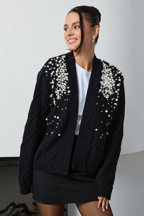 CARDIGAN EN MAILLE TORSADÉE ORNÉ DE STRASS NACRÉS EN VENTE B2B