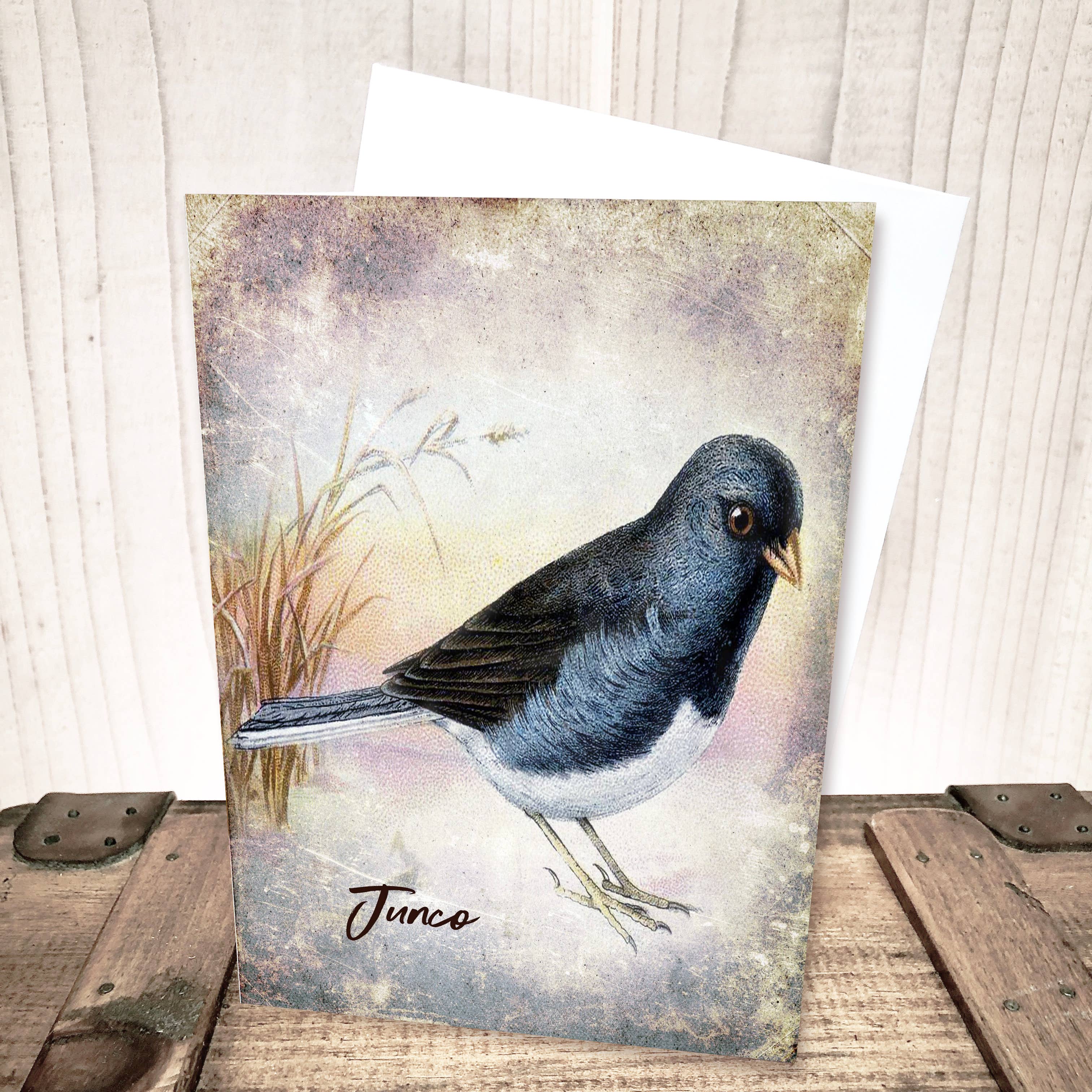 Carte de vœux Junco Wild Bird pour un oiseau ou un amoureux de la nature. Les ailes sauvages sont vierges à l'intérieur pour écrire votre propre message personnel et/ou ajouter votre photo préférée. Une touche subtile d'éclat peint à la main pour mettre en évidence. Il vous est livré emballé individuellement avec l'enveloppe incluse. Fabriqué en utilisant des matériaux de qualité issus de ressources respectueuses de la terre et durables. Nécessite un affranchissement standard pour envoyer.