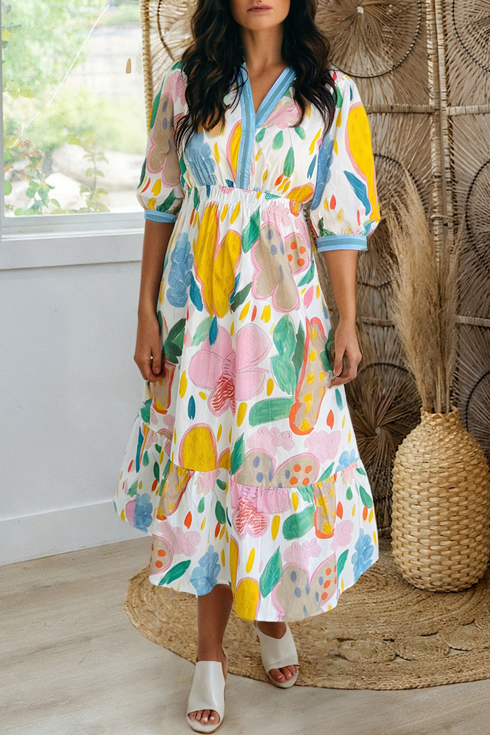 Robe en satin à volants à col à volants et à motifs floraux abstraits pour femmes en vente B2B