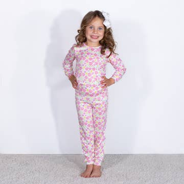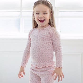 Ensemble de pyjama à manches longues avec volants arrière signature en viscose de bambou rose motif jardin de papillons pour filles SoftSnooze™. en vente B2B