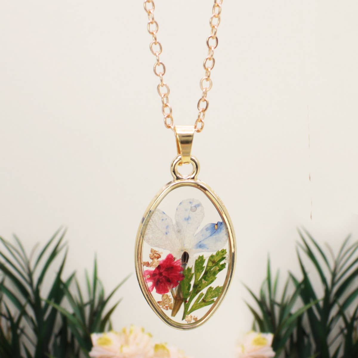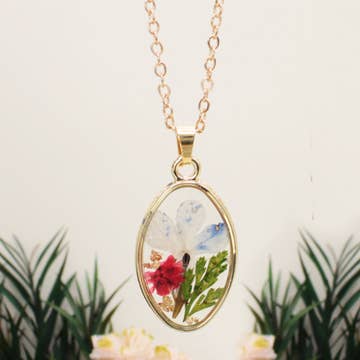 Collier Véritable Fleurs Pressées et Résine Or Ovale en Rose, Jaune Bleu & Blanc en vente B2B