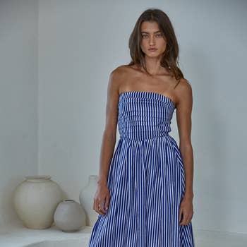 L’impression shibori consiste à utiliser une aiguille crochetée pour pincer des sections du tissu. Un fil est ensuite enroulé deux fois autour de chaque section. Le tissu teint ainsi obtenu présente un motif intéressant ainsi qu’un effet rappelant l’eau. Cette robe maxi en coton lumineuse et solaire a été teinte à la main en utilisant la méthode shibori à Jaipur, en Inde. Elle est ample et confortable, convenant à différentes morphologies, et se noue sur une épaule. Chaque robe, étant teintée à la main, présente des variations légères de couleur et de placement des motifs. DÉTAILS DU PRODUIT : * 100 % coton * Poches * Un lien ajustable avec pompon * Lavage à la main à froid * Fabriquée au Rajasthan, Inde Collection été 2025, robe d’été