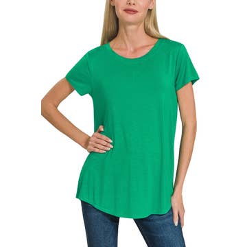Haut à manches courtes et col en V avec ourlet haut-bas.