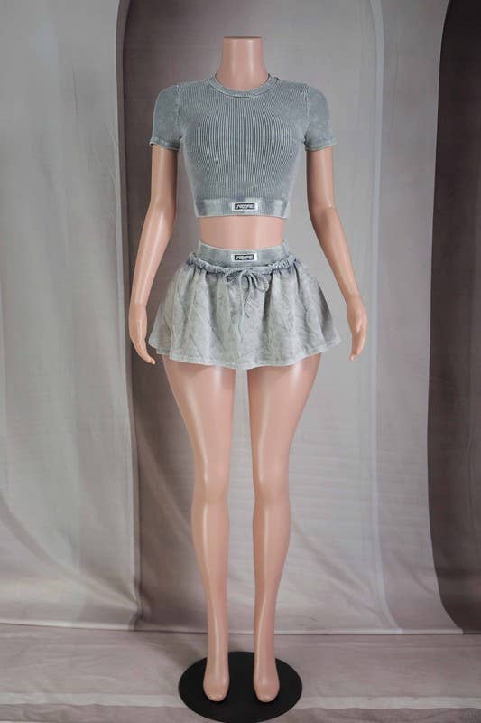 ST1633 -LAVAGE MINÉRAL -L'ENSEMBLE COMPREND UN HAUT ET UN BAS -HAUT COURT AVEC DÉCOUPES À L'AVANT ET À L'ARRIÈRE -MINI-JUPE CARGO AVEC POCHES LATÉRALES ET TAILLE ÉLASTIQUE -EXTENSIBLE