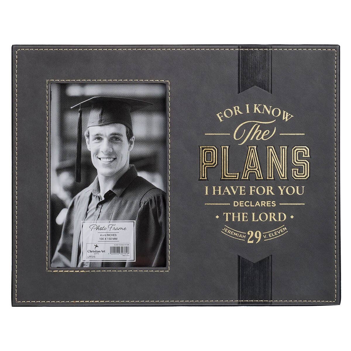 Le cadre photo avec passe-partout est idéal pour afficher une photo préférée du nouveau diplômé. Imprimé sous le verre, on trouve "Félicitations Diplômé" ainsi que "Car je connais les projets que j'ai formés sur vous" et la référence du verset Jérémie 29:11. Le verre est surélevé de 3/4" au-dessus du passe-partout et de l'impression pour un effet de boîte à ombre. Accueille une photo de 5" x 7". Le dos amovible comprend un chevalet escamotable ainsi que des crochets pour une exposition sur table ou murale. Le cadre en bois est fini en noir. La taille extérieure de la pièce est de 9" x 11" x 1 1/4". Assemblé aux États-Unis avec des matériaux importés.