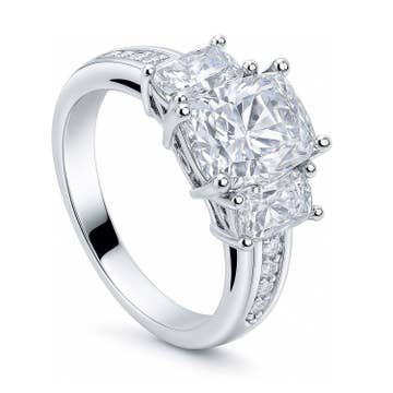 Ensemble de deux bagues en argent sterling rhodié et zircone cubique. La bague solitaire est ornée d'un zircone cubique carré de 7 mm avec des griffes aux coins et d'un halo serti de zircone cubique de 1 mm qui s'étendent à mi-hauteur du bracelet. La bande d'accompagnement est ornée de CZ de 1 mm le long de la bande supérieure et de la bande médiane vers le bas. Disponible en tailles complètes 4-11.