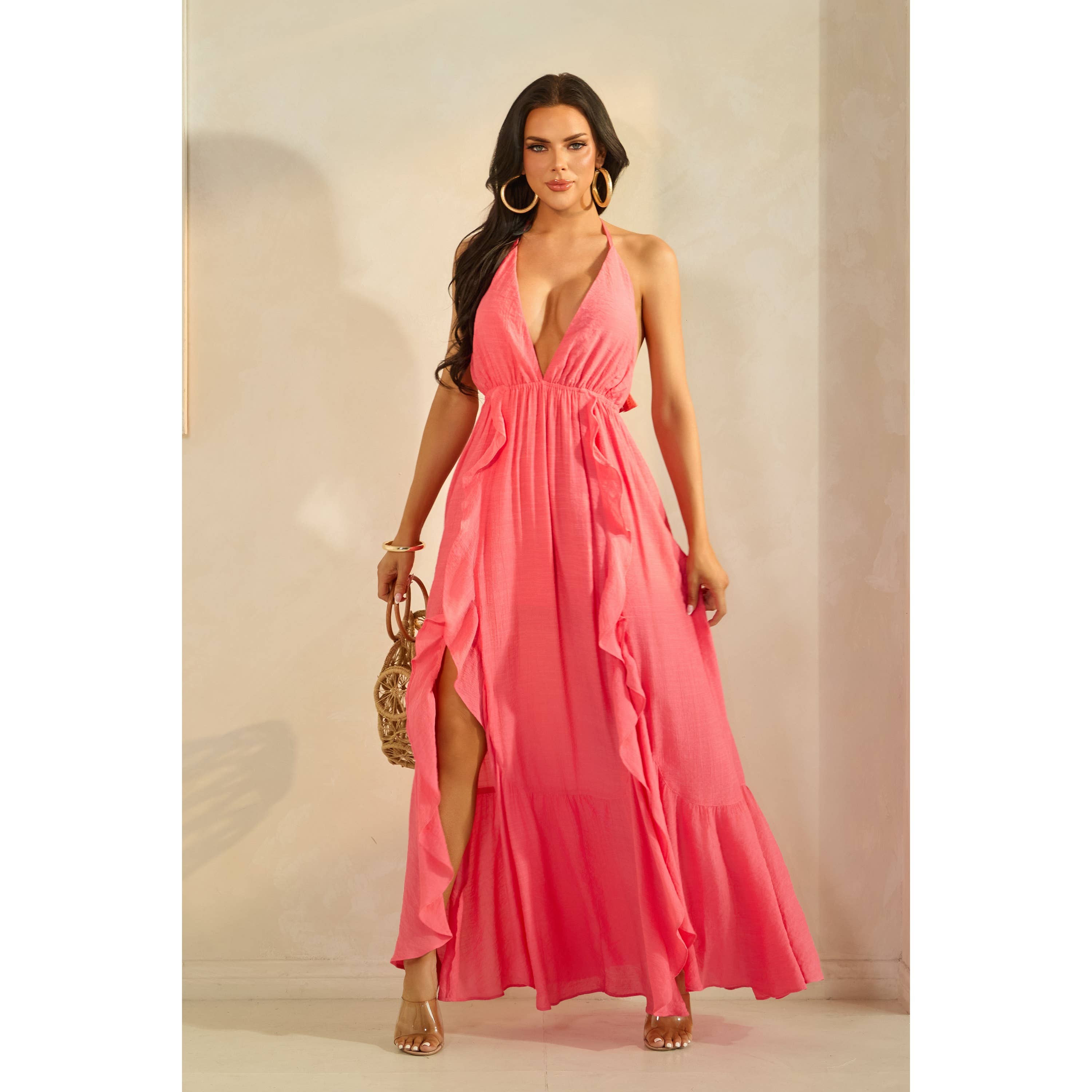 Robe maxi grande taille en mesh avec col en V, volant et fente latérale en vente B2B