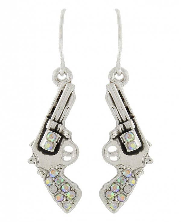 Boucles d'oreilles clous/poussoirs pistolet western en filigrane argent antique FR3013 Boucles d'oreilles clous pistolet western en filigrane rose FR3015 Boucles d'oreilles clous pistolet western en filigrane patiné Bijoux pistolet cowboy Boucles d'oreilles bouton en métal avec strass Largeur x Longueur : 7/8" X 1/2" Couleur du métal : Argent antique Fermeture des boucles d'oreilles : Clou/Poussoir Zinc, Épingle : Titane Sans plomb, nickel et cadmium