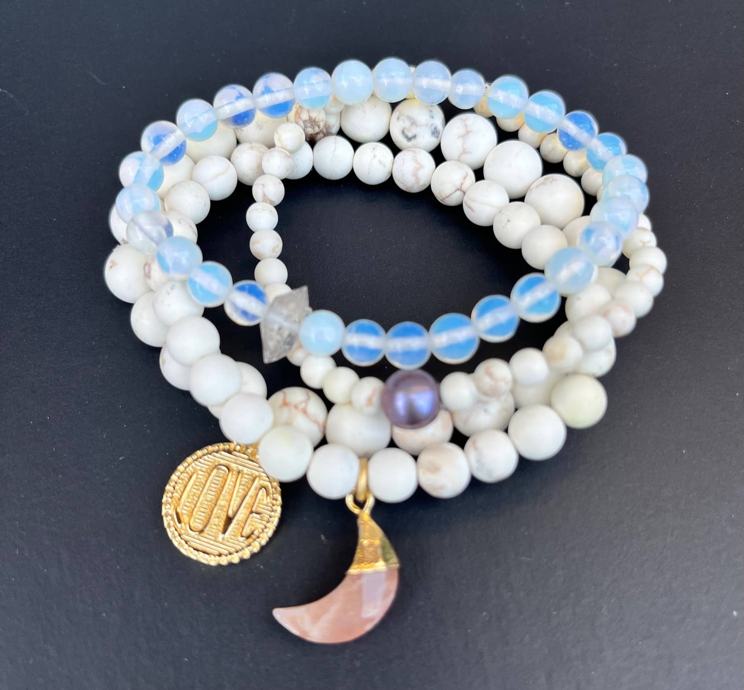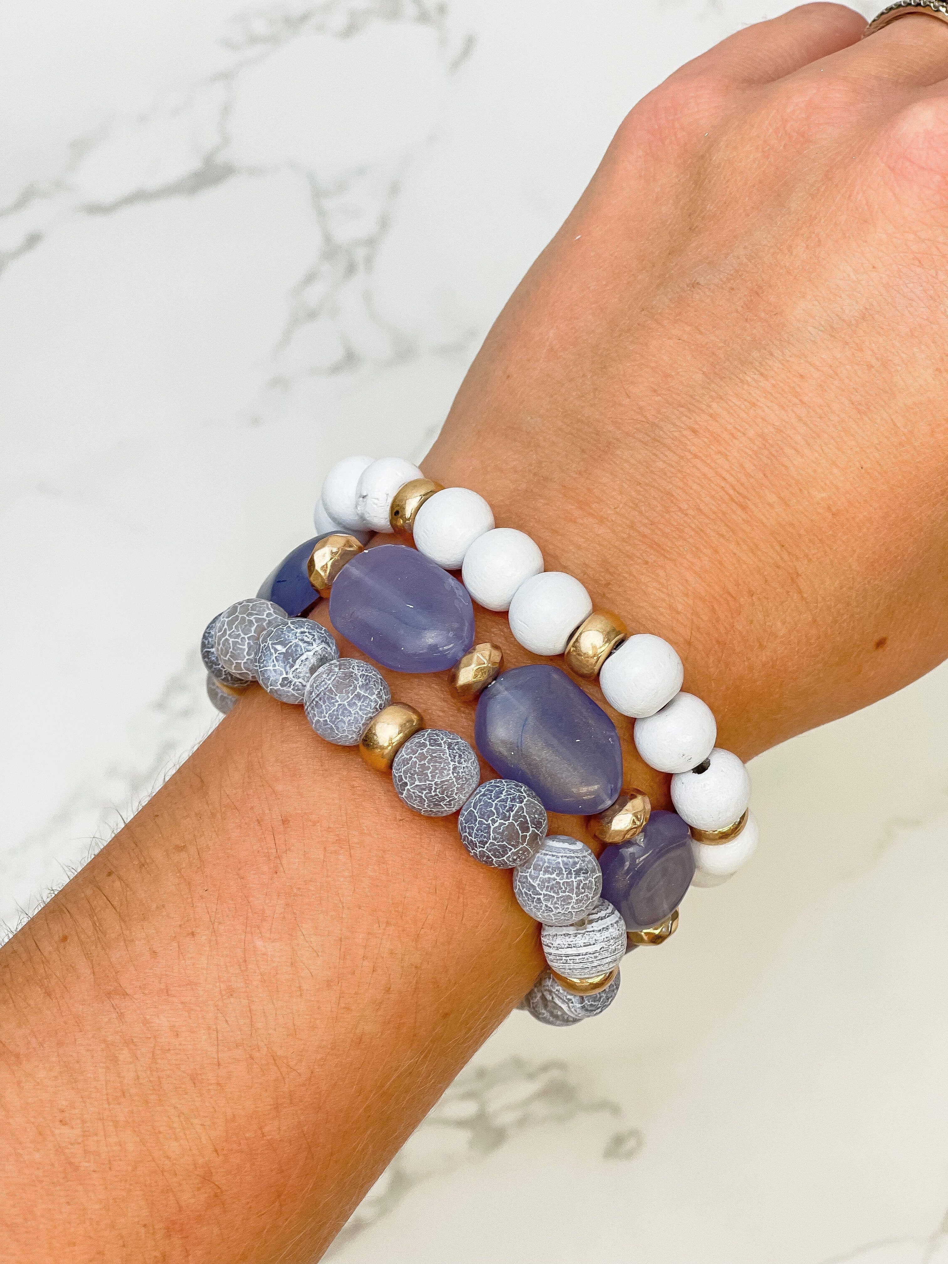 Empilement de 5 bracelets faits main avec perles MATÉRIAUX : Chaque ensemble est composé d'une variété de perles allant de 4 mm à 8 mm, de fausses perles, d'alliage, de perles semi-précieuses et de rocaille, ainsi que de breloques en alliage, enfilées sur un élastique très résistant. Avec soin, ils devraient durer longtemps. **Veuillez noter que les breloques et les perles peuvent être légèrement différentes de celles montrées sur la photo en fonction du stock et de la disponibilité actuels. Chacun des bracelets est enfilé sur un élastique très résistant et mesure 18-19 cm de longueur. EMBALLAGE : Chaque ensemble est attaché avec un ruban pour l'exposition et emballé dans un sac en organza pour la vente.