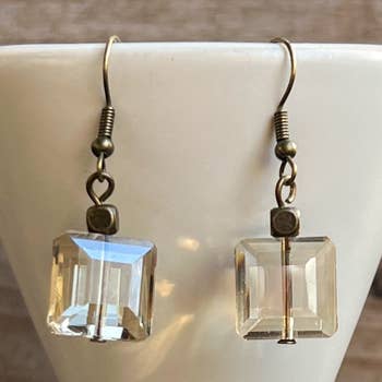 Boucles d'oreilles uniques en cristal faites main Cristaux de champagne carrés, enroulés de fil de fer et sertis dans des cadres rectangulaires en or forgé Tous les fils sont résistants au ternissement et durent. Fils d'oreille hameçon plaqués or. Les boucles d'oreilles mesurent 2 po Collier assorti : #4449 https://www.faire.com/product/p_pbbpu43a7g?refB=1