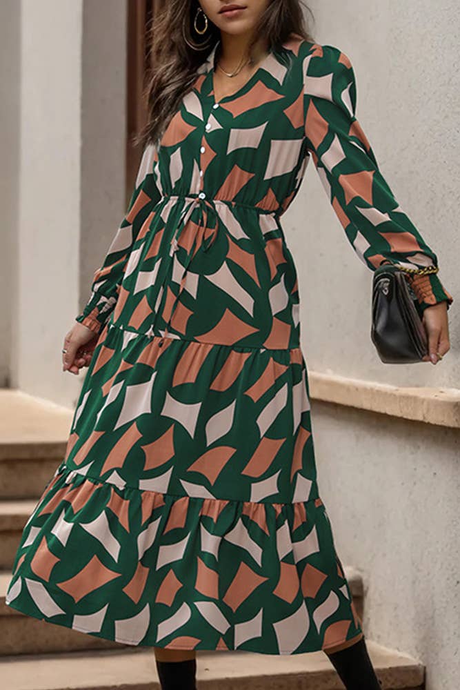 ROBE MIDI À MANCHES LONGUES ET COL EN V À IMPRIMÉ ABSTRAIT ET DEMI-BOUTON SUR LE DEVANT AVEC POCHE LATÉRALE - Robe midi à manches longues et imprimé abstrait - Design à col en V avec fermeture à demi-bouton sur le devant - Motif abstrait géométrique sur l'ensemble - Manches longues légèrement gonflées au niveau des épaules MESURES DE STYLE (TAILLE S) - LONGUEUR TOTALE 48 POUCES - BUSTE 18 POUCES - TAILLE 13 POUCES - LONGUEUR DE MANCHE 25 POUCES 100 % POLYESTER | DOUBLURE : 100 % POLYESTER LE MANNEQUIN MESURE 5 PIEDS 10 POUCES | TOUR DE POITRINE 34 POUCES | TAILLE 24 POUCES | HANCHES 35 POUCES ET PORTE UNE TAILLE S