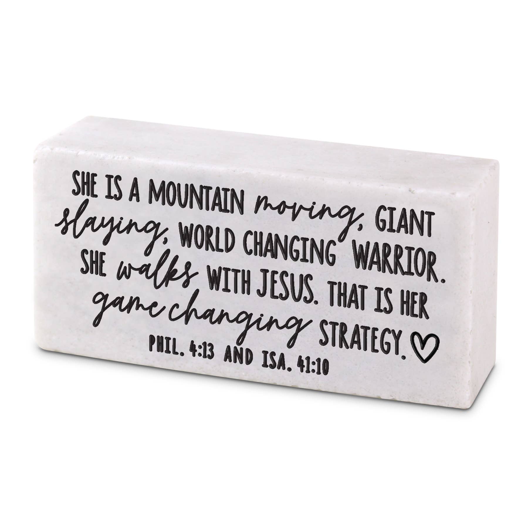 Célébrez, honorez et affirmez-la ! Ce bloc de versets est une belle façon de reconnaître son espoir, sa foi et sa confiance en Dieu. Ce cadeau fait la différence. Grâce à un partenariat avec l'association à but non lucratif A Better Life For Kids, les orphelins, les enfants ayant des besoins spéciaux et les familles reçoivent des repas sains, de l'eau potable, un logement sûr et des opportunités éducatives au Ghana, en Afrique. Matériau : pierre moulée. Taille : 10 x 2,5 x 5 cm.