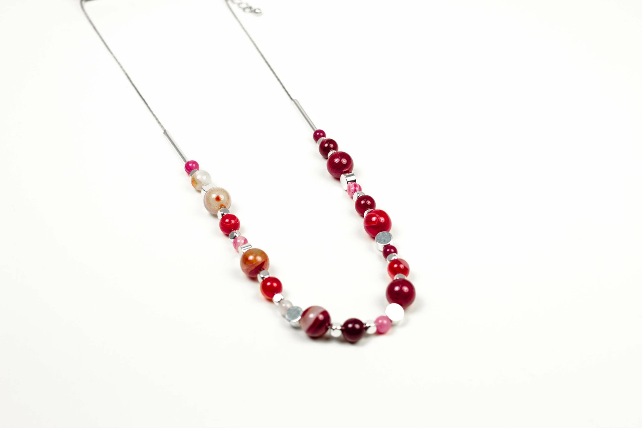 Chaîne longue dont la partie inférieure se divise en 10 chaînes colorées différentes, faites de perles émaillées artificielles.