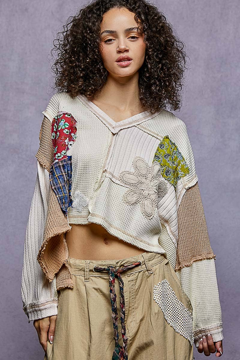 * N° de style : BT1057_1 HAUT PATCHWORK CROISÉ EN CÔTES LAVÉES - IMPORTÉ - DÉTAIL LAVAGE MINÉRAL - COUPE DÉCONTRACTÉE - TAILLE RÉELLE - NOTRE MODÈLE PORTE TOUJOURS LA TAILLE "S" - COMPOSITION DU TISSU : PRINCIPAL : 100 % COTON CONT 1 : 100 % RAYONNE