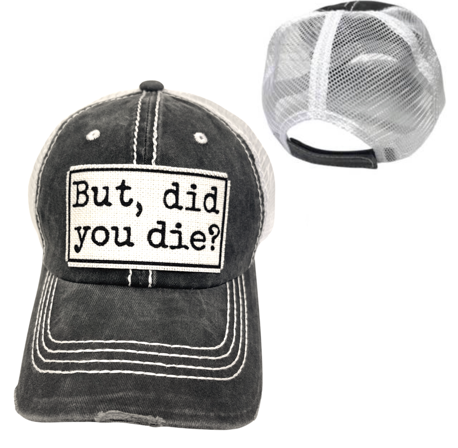 Casquette de camionneur vintage effet vieilli « Your Crazy Is Showing You Might Want to Tuck That Back In » Couleur : Noir vieilli Matériau : mélange coton/polyester, dos en filet. Taille : taille unique, avec une sangle ajustable à bouton-pression. Casquette unisexe.