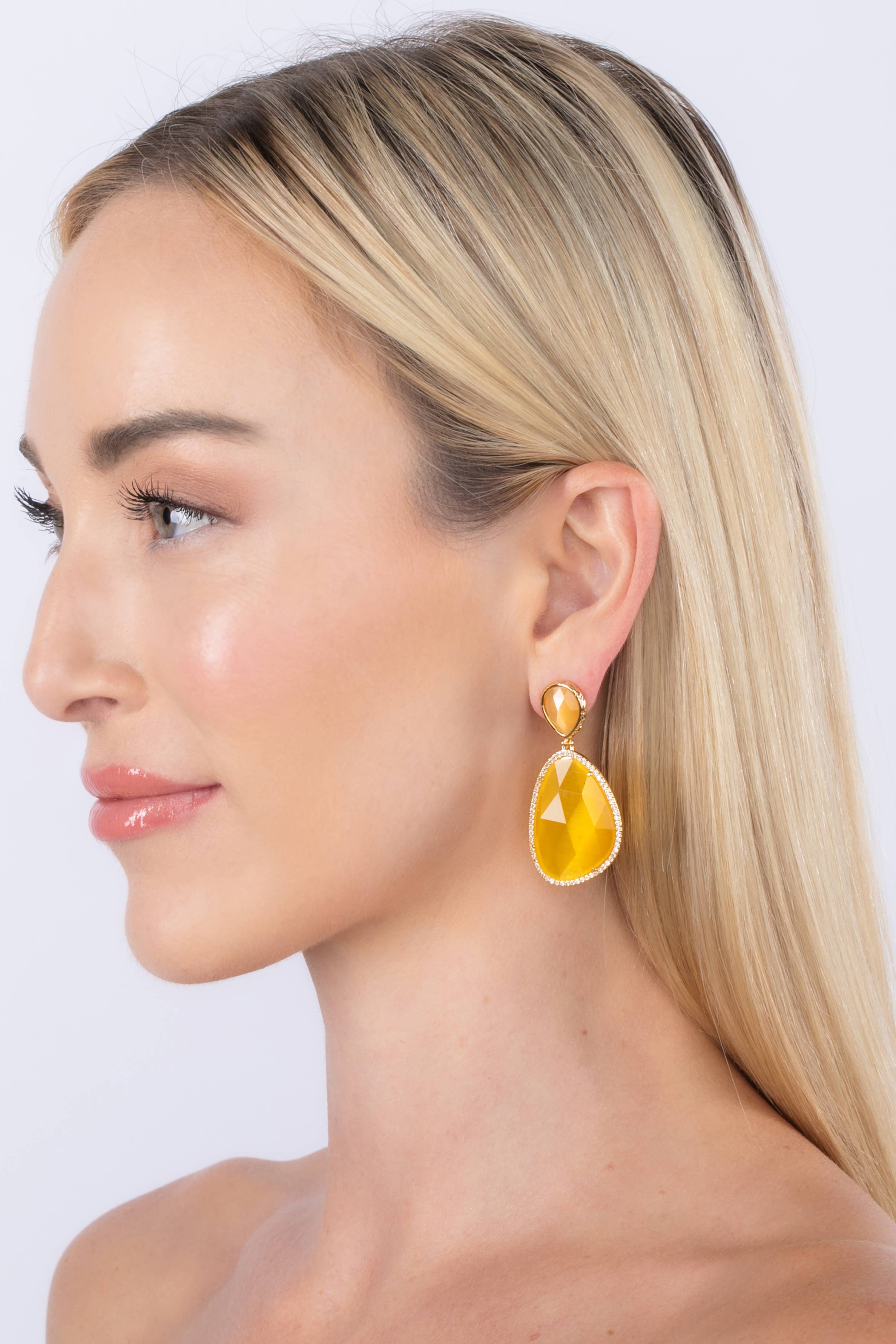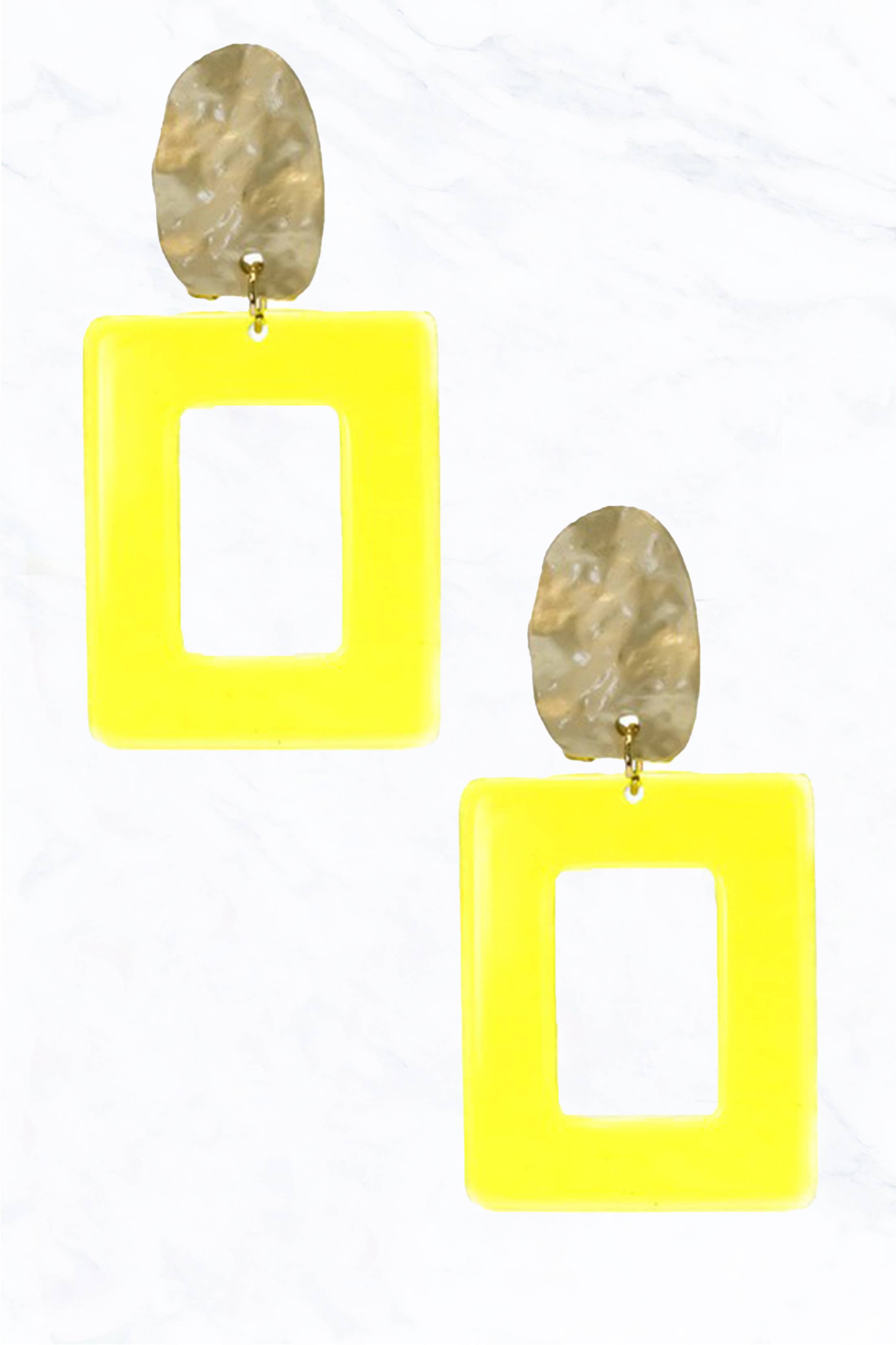 Les formes rectangulaires jaunes vives sont en cascade à partir d'un clou en forme de boule rose clair. Chaque boucle d'oreille mesure environ 3,25 po ou 80 mm de longueur et est super légère. Les boucles d'oreilles sont faites avec des pièces de lucite principalement vintage qui ont été faites aux États-Unis dans les années 1960 - début des années 80. Nous les plaçons à la main avec des poteaux de boucle d'oreille en acier chirurgical et ils ont des arrières robustes en acier chirurgical et acrylique sur eux ainsi.