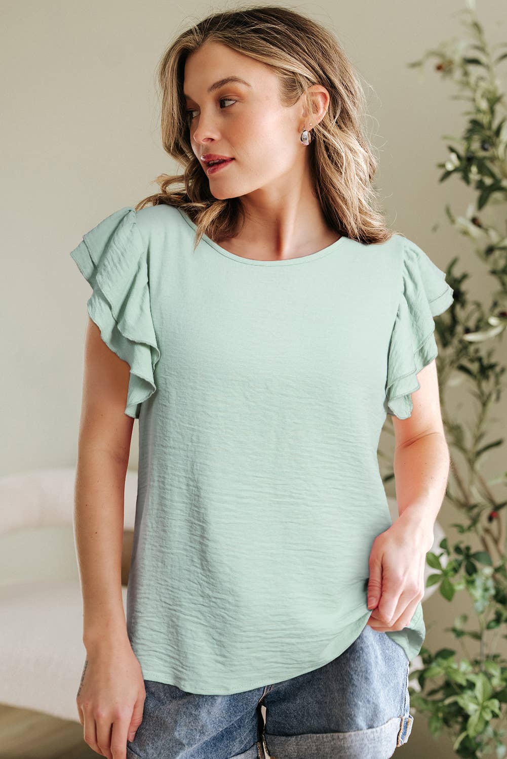 I-FS293 Haut en rayonne à ourlet volanté