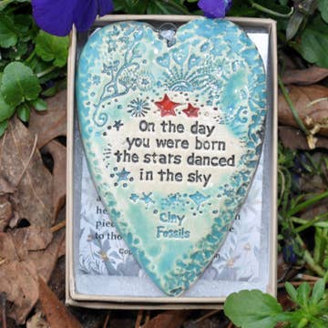 Faites-leur savoir à quel point vous tenez à eux lors de leur journée spéciale. Chacune de ces pièces de poterie faite à la main provient de mon petit atelier à domicile. Vous verrez des variations de couleur, de glaçure, de taille, etc., car elles sont fabriquées une pièce à la fois et non produites en série. Ces variations font partie de la beauté de l'artisanat. Accrochez-les à un arbre, une cheminée, un rétroviseur de voiture, un tiroir, une valise, etc. Livré avec une boucle en métal intégrée dans l'argile pour l'accrochage. Mon travail s'adresse à ceux qui nourrissent, aiment et cherchent à vivre en harmonie. Chaque création artisanale incarne l'esprit de révérence d'un hippie pour la terre, invitant tous à chérir un art aussi significatif que magique. Livré dans une boîte avec une carte sur l'artiste. Certains commentaires que je reçois des propriétaires de magasins indiquent que les clients s'arrêtent pour lire les messages et finissent par en acheter plusieurs à cause des mots et des images. Ces pièces sont agréables à exposer toute l'année. Cuites deux fois dans un four céramique à environ 2000 degrés F Environ 2,75 à 3 pouces de longueur