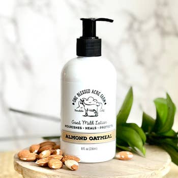Goats N' Oats | Lotion au lait de chèvre. L'huile essentielle d'amande pure est un parfum doux et noisette avec des notes de cerise. C'est un parfum classique que tout le monde adore. Notre formule de lotion au lait de chèvre utilise la bonté du lait de chèvre pur pour réhydrater votre peau. Elle s'absorbe rapidement, ne bouche pas les pores et laisse la peau soyeuse. Découvrez la polyvalence de notre lotion au lait de chèvre. Sa texture légère et non grasse en fait non seulement un produit de soin de la peau, mais aussi un essentiel de maquillage. (*non parfumée est recommandée pour le visage si vous avez la peau sensible). Parfait pour les bas de Noël, les coffrets cadeaux et les cadeaux de fête — une petite bouteille de soins festifs pour tout le monde sur votre liste de Noël. Ingrédients : eau, lait de chèvre, jojoba, cire émulsifiante végétale, glycérine végétale, huile essentielle d'amande, optiphen. Fait main dans le Montana, USA. Taille : 8 oz.