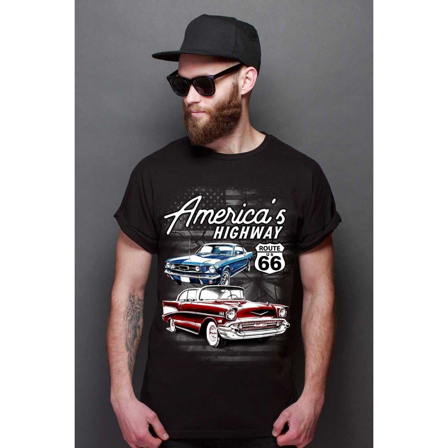 « Créé en utilisant les grandes villes le long de la légendaire route 66. L'une des autoroutes américaines originales, US Highway 66, partait de Chicago, dans l'Illinois, jusqu'à Los Angeles, ca couvrant plus de 2 400 miles. Il a été l'inspiration pour une chanson à succès ainsi qu'une émission de télévision à succès. Route 66 sera à jamais symbolique avec le côté rock & roll de la culture pop. Pour ajouter notre petit peu de magie à ce panneau emblématique, nous avons pris les grandes villes le long de la route et recréé le célèbre panneau de la route 66. »