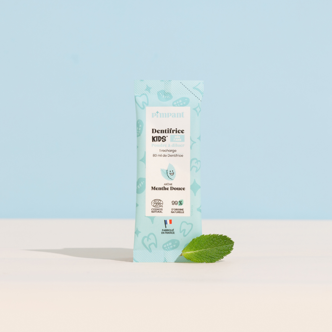 Une recharge en poudre de 8gr à diluer avec l’eau du robinet permet de créer 80ml de dentifrice à la fraise (comme un dentifrice en tube classique). Les + du dentifrice Kids : 🌿 contient 99% d’ingrédients d’origine naturelle 🐄 fabriqué en Normandie, près de Caen 💧 a été conçu pour limiter le transport d’eau et donc son poids pendant le transport 🔁 emballage recyclable dans la filière papier 🍓 légèrement sucré à la stévia et au bon goût de fraise Notre objectif ? Un dentifrice en poudre à diluer qui protège les dents sensibles de vos mousses en prenant soin de notre planète.