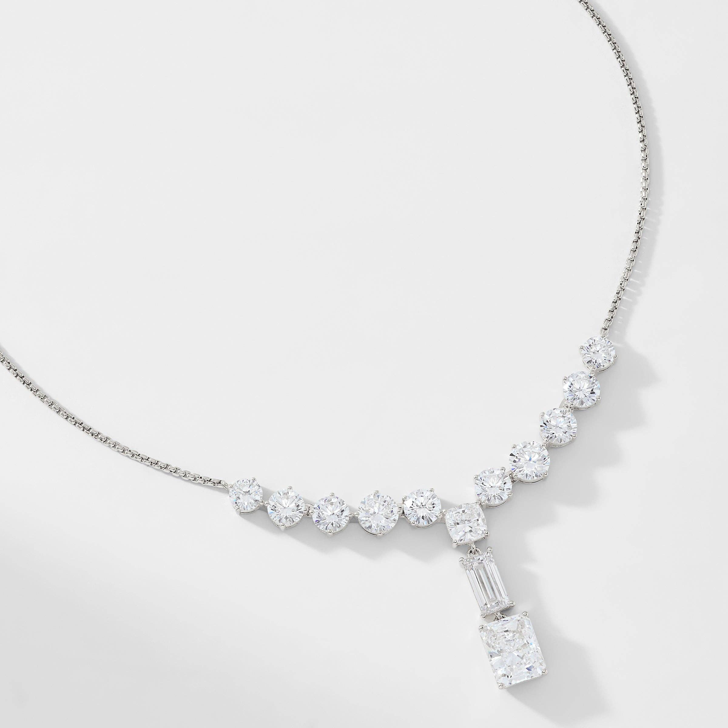 Le complément parfait à nos boucles d'oreilles Chloe Pear Drop les plus vendues, ce collier en Y simple et chic fait forte impression avec une combinaison scintillante de pierres CZ ovales et en forme de poire pour éblouir n'importe quel décolleté.