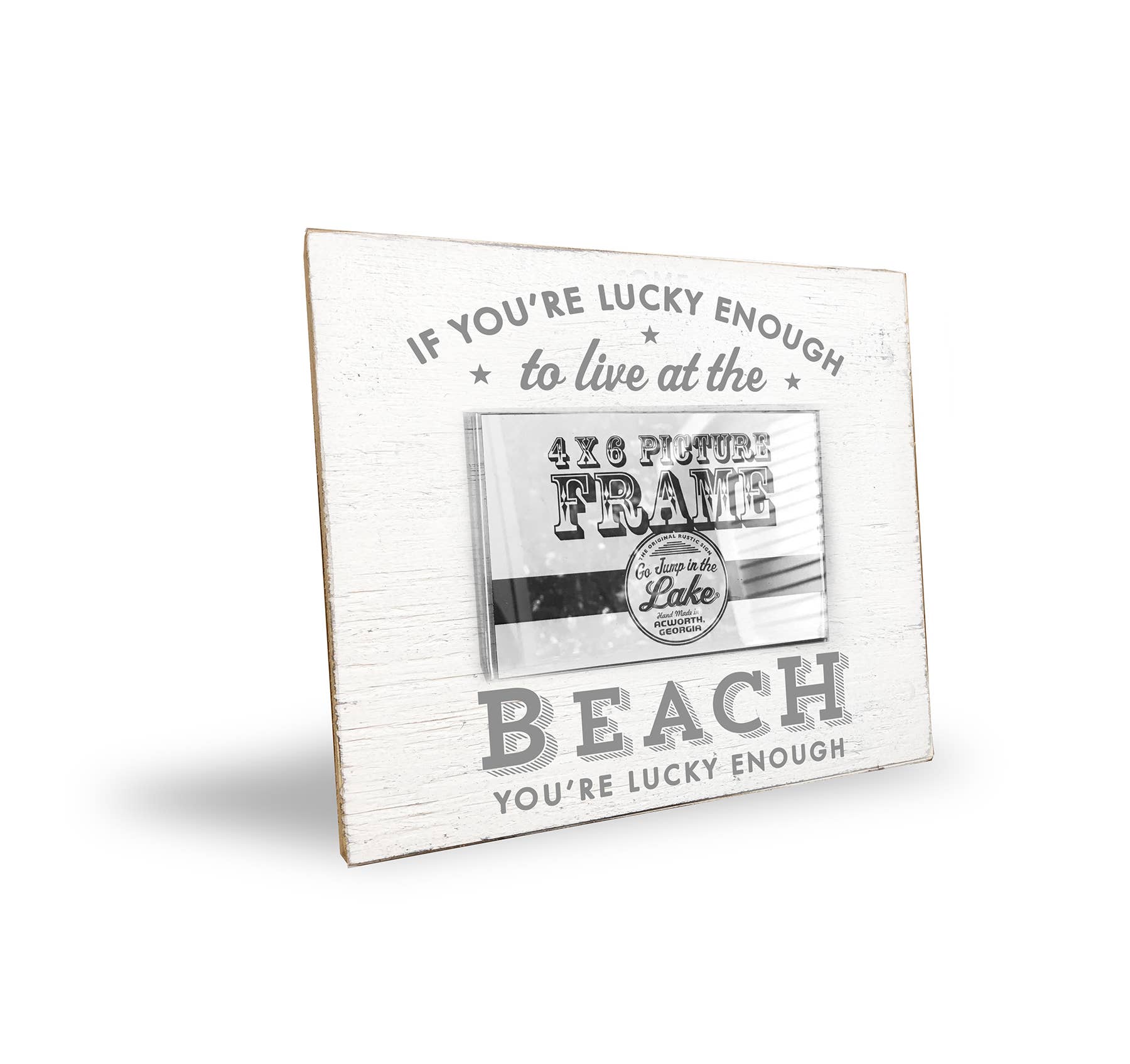 Le cadre photo autoportant, emballé dans une boîte en carton ouverte et un emballage en plastique, est fabriqué à partir de MDF et de verre et convient à une photo de 4 x 6 pouces. Le texte « Memories Are Made At The Beach », imprimé au-dessus de la photo remplaçable, est accompagné du logo Beach People imprimé. Enlevez la poussière en l'essuyant avec un chiffon doux. Idéal pour ceux qui souhaitent montrer leur amour de la plage.