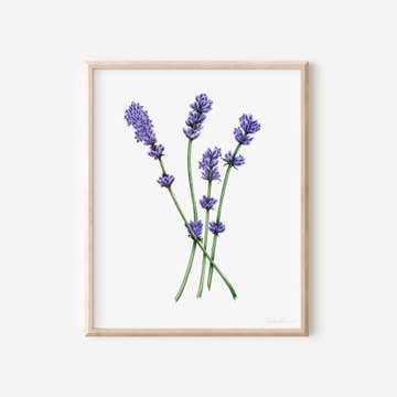 Rappelez-vous la beauté de la lavande fraîche avec cet imprimé aquarelle. Ce motif mesure 8 x 10" et a été imprimé à Seattle sur du papier de coton et emballé avec une planche arrière robuste et une pochette en cellophane. Le cadre n'est pas inclus.
