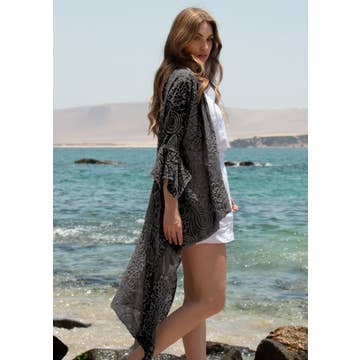 Kimono en mousseline noire et or à phases lunaires, robe / poncho