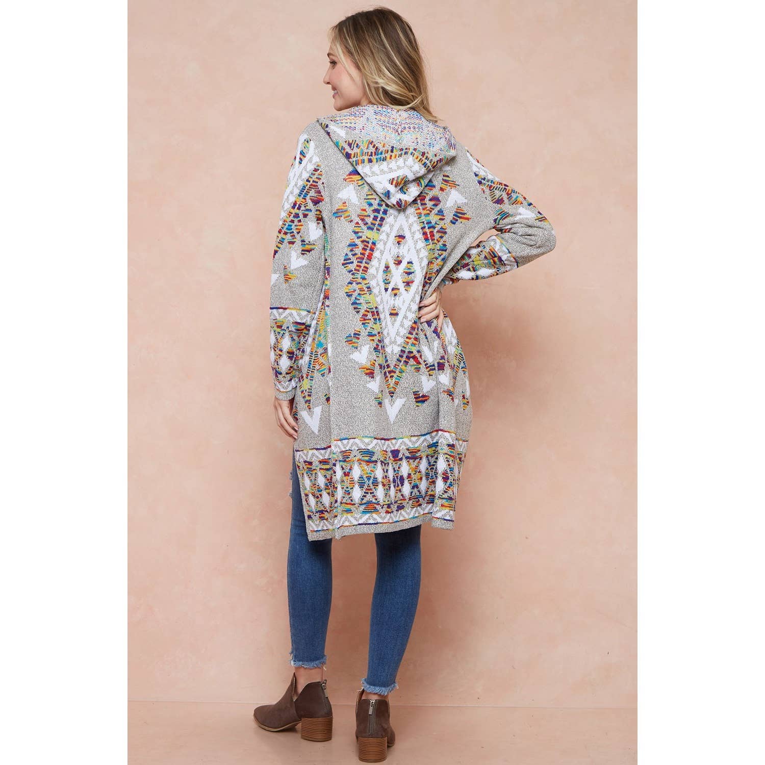 - Cardigan long ouvert à capuche en intarsia multicolore arc-en-ciel - 100 % acrylique