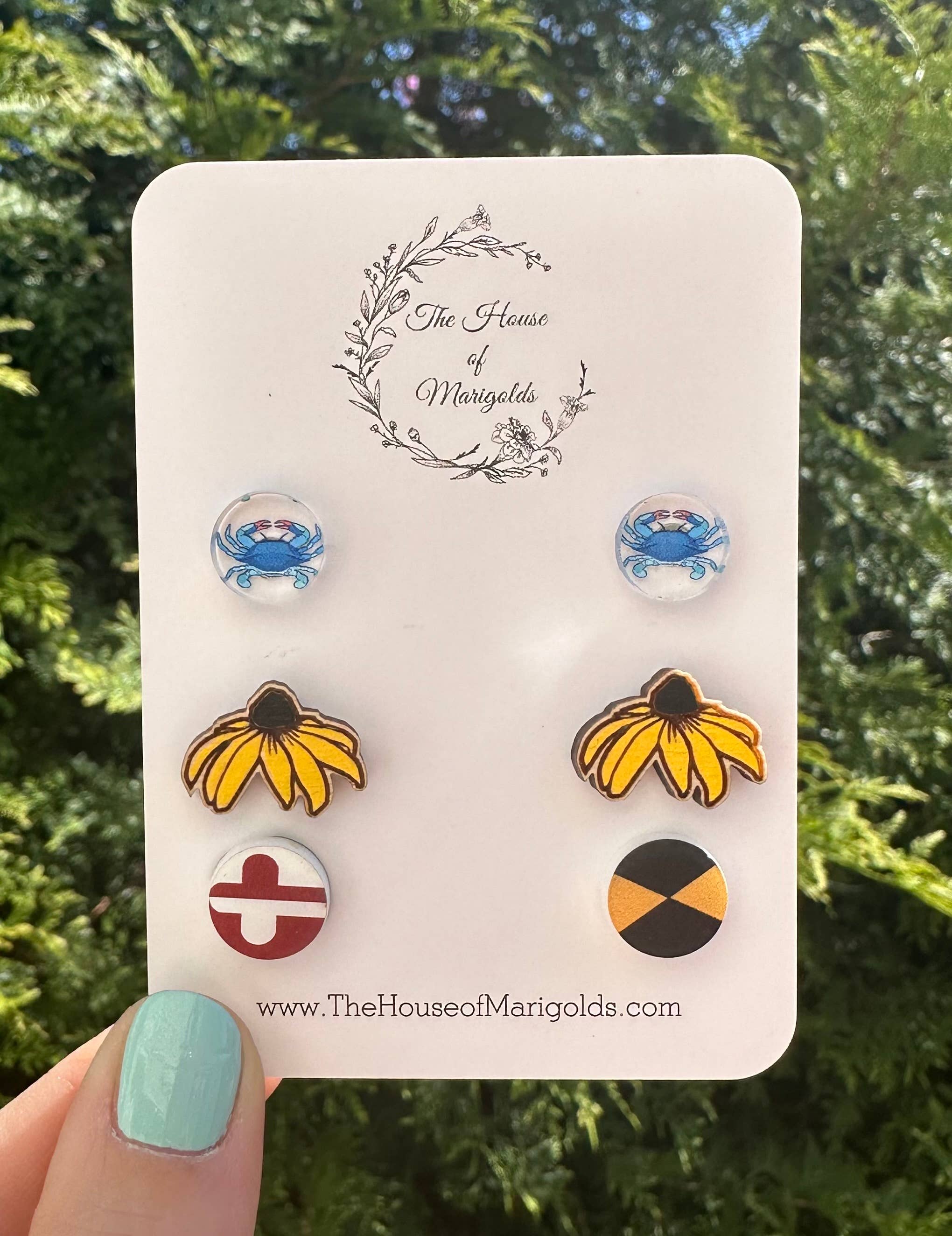 Chaque paire de boucles d'oreilles est découpée dans un motif du drapeau du Maryland, puis attachée au support de votre choix. Comme il est découpé à partir d'un motif, chaque paire présentera de légères variations dans l'emplacement du drapeau. Poteaux en acier inoxydable. Les boucles d'oreilles sont attachées à une carte avec logo. Veuillez noter que les couleurs peuvent être légèrement différentes en raison des différences entre les paramètres des écrans d'ordinateur. Chaque boucle d'oreille est fabriquée à la main et de légères imperfections peuvent apparaître.