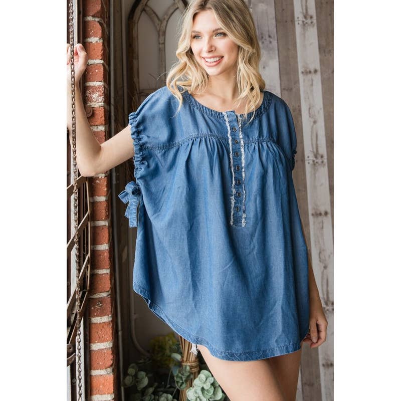 -Haut décontracté en forme de poupée surdimensionné -Couleur denim légèrement délavée -Manches courtes avec revers retroussables -Encolure bateau ornée de coutures -Fermeture arrière à boutonnage -Poche avant sur la poitrine -Ourlet effiloché avec fente latérale -Importé Lavage à la main 100 % coton Le mannequin mesure 1,80 m et porte une taille S.