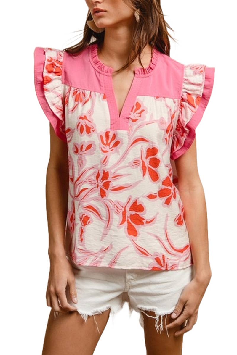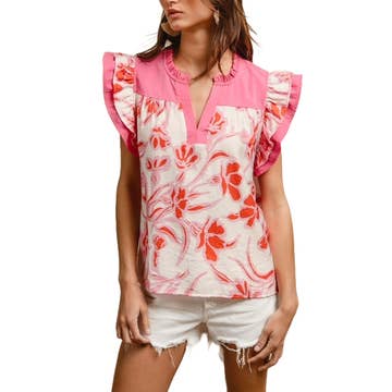 UN HAUT FLEURI DOTÉ D'UN COL MONTANT FRONCÉ, DE MANCHES COURTES VOLANTÉES, D'UN OURLET ARRONDI ET D'UNE COUPE DÉCONTRACTÉE. *LE MANNEQUIN PORTE UNE TAILLE S