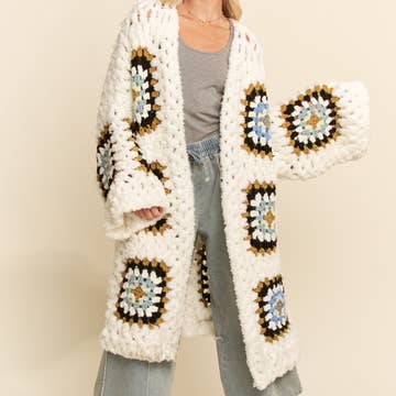 Cardigan en maille ouverte bicolore en crochet carré à motif floral en vente B2B
