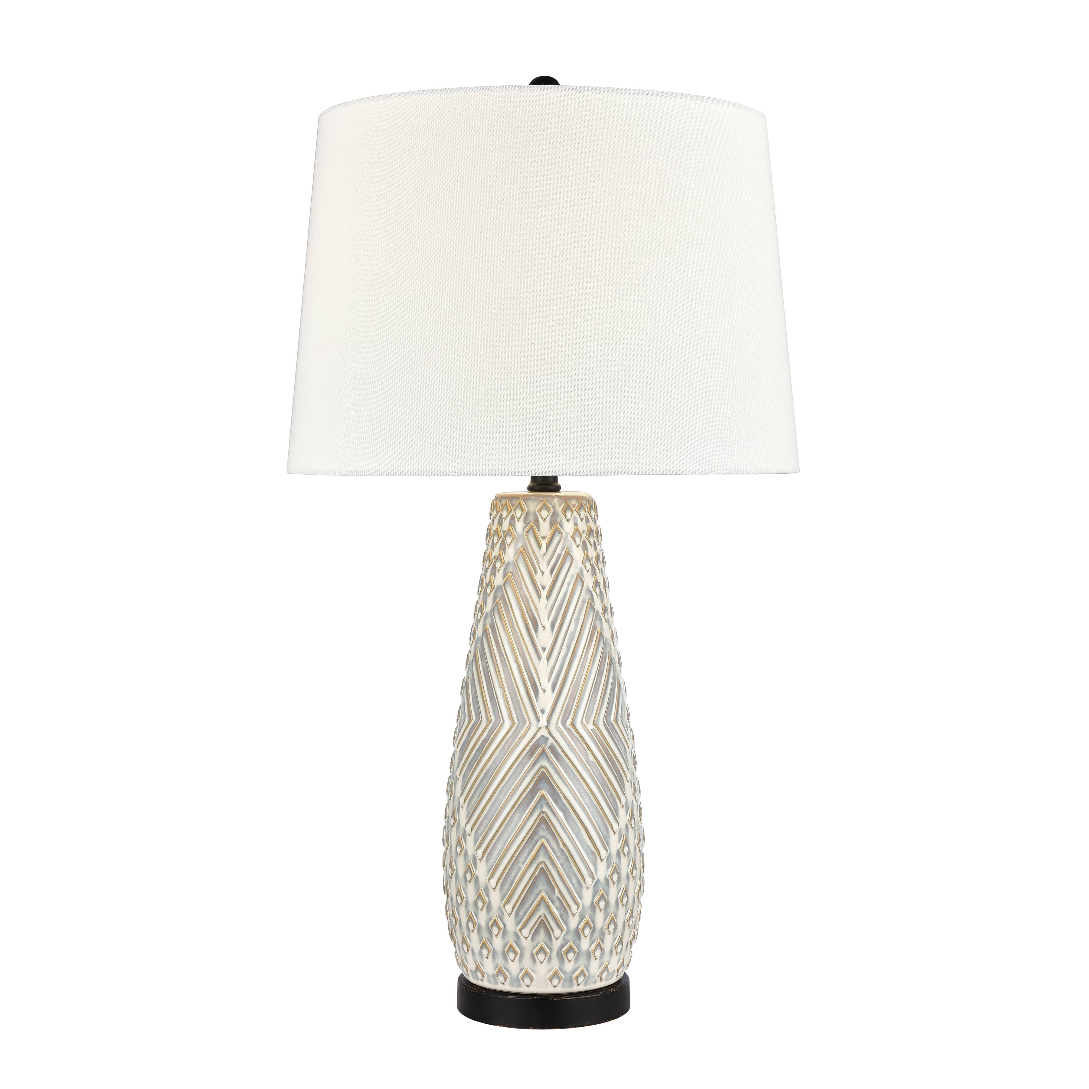 Le motif texturé de cette lampe de table en céramique est mis en valeur par la combinaison de couleurs rouille et aqua, ainsi que par les accents en nickel brossé. L'abat-jour rond cartonné est en lin beige légèrement flamboyant. En raison de la nature des glaçures cuites sur les lampes en céramique