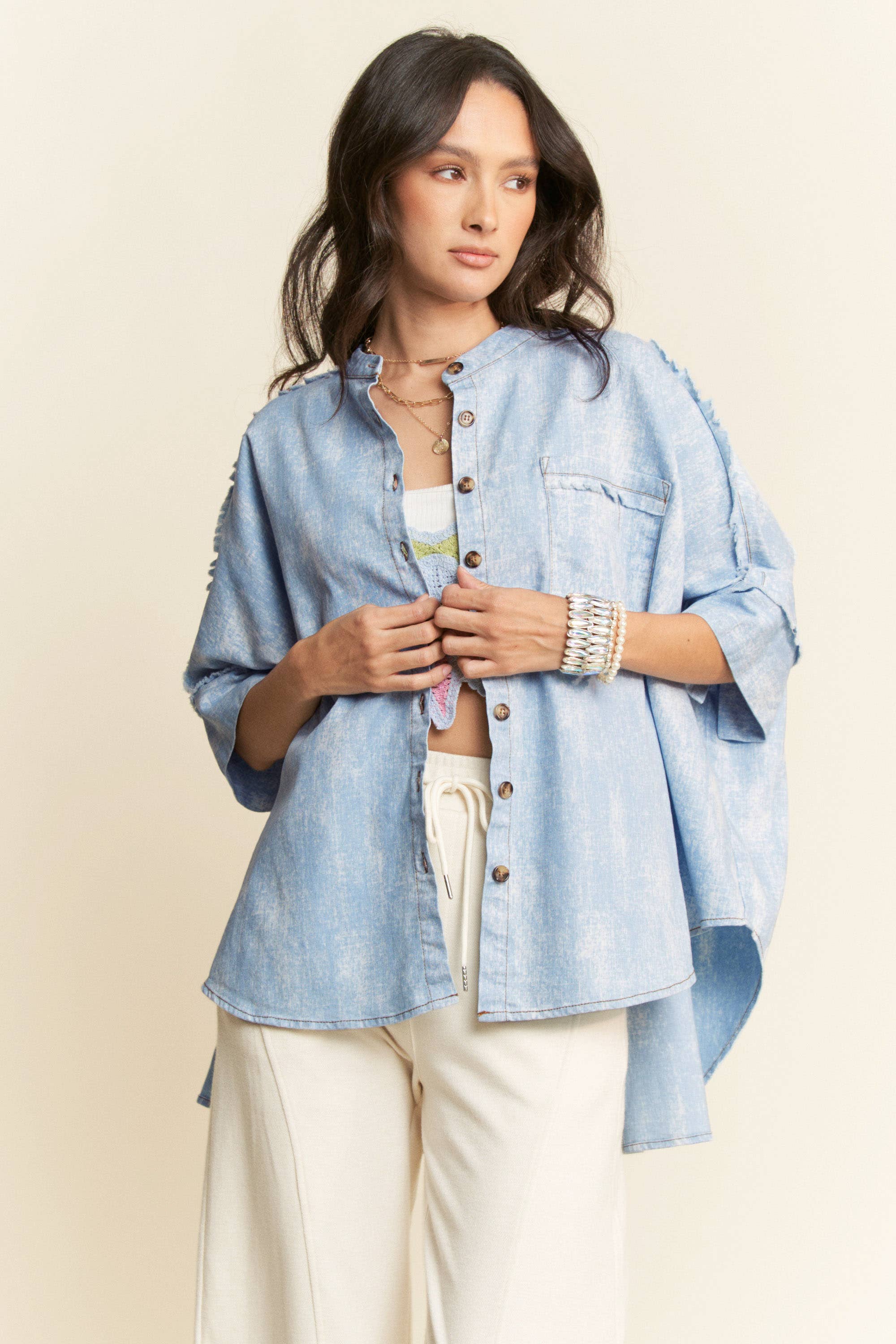Une chemise décontractée à col en V fendu Dolman avec un magnifique dos tulipe ouvert et décontracté, des manches 3/4 volantées, le tout en 100 % coton léger et respirant pour un look estival aéré. Disponible dans la couleur Blue Yarn Dye. dans les tailles S, M, L et XL. 100 % coton.