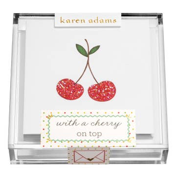 Adorables mini-notes plates de taille 4 bar avec une œuvre d'art originale imprimée de cerises et des détails pailletés à la main. Comprend des enveloppes roses charmantes et des autocollants assortis "cerise sur le gâteau". Ensemble de 5 pièces scellé dans une pochette et noué avec un ruban ! Laissez un mot. Parsemez un sourire !