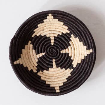 Ces paniers sont dotés de boucles à l'arrière pour qu'ils soient prêts à être accrochés ! Ce style utilise des teintures végétales naturelles de brun, de bleu et de violet. Tissé à partir d'herbes sauvages, ce magnifique panier est fabriqué par le groupe Tonga dans la région de Binga, dans le nord du Zimbabwe. À l'origine, ils étaient utilisés pour vanner les grains, mais ils sont très populaires pour la décoration intérieure. Chaque panier est unique en termes de motif et de style de tissage. Vous recevrez un panier unique.