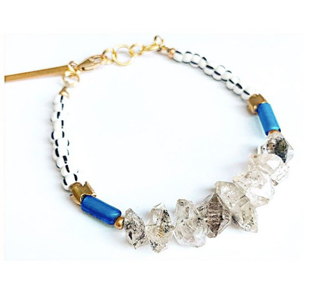 Fabriqué à la main à Brooklyn, New York. Les cristaux de quartz en diamant Herkimer lumineux aux multiples facettes sont le point central de ce bracelet de Noël lumineux et immaculé. Orné de longues perles de verre bleues et de quelques perles à rayures noires et blanches amusantes, ce bracelet est un véritable joyau artisanal. Le fermoir à remplissage en or 14 carats garantit que le bracelet ne ternit pas. Les mesures sont de 6 3/4 pouces mais réglables jusqu'à 7 pouces.
