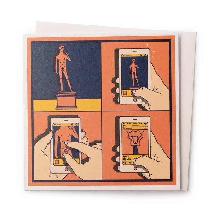 Cette annonce concerne une carte de vœux pliée de format A2 (4,25x5,5 pouces) BLANCHE à l'intérieur et une enveloppe French Paper speckletone 70lb à Madero Beach. La carte est imprimée à plat à Portland, Oregon. Le papier est un carton blanc non couché de 120#. *Veuillez noter : La carte et l'enveloppe seront emballées dans une pochette en cellophane transparente avec rabat scellé. Le design présente l'œuvre de collage abstrait "Allons au musée d'art" avec un buste romain par Colleen Harrington. Le dessin à la main a été inspiré par un ancien buste romain d'Agrippine. Cette carte amusante est idéale pour les amateurs d'art, les étudiants en histoire et en lettres classiques, et les fans de la Grèce et de Rome antiques.