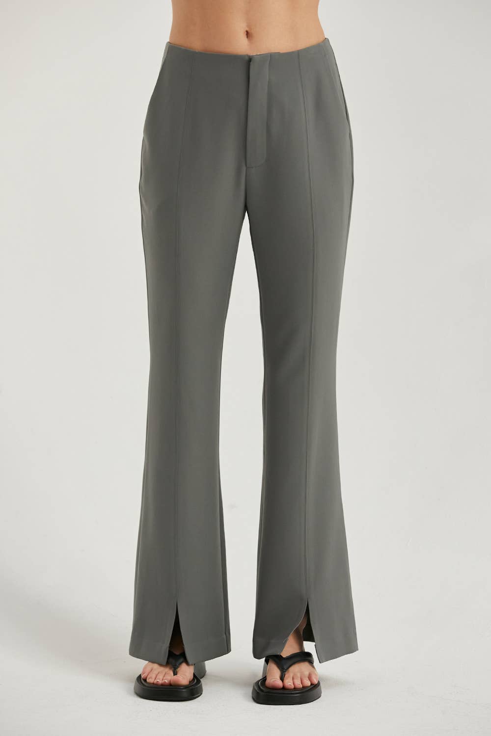 Notre pantalon Lois présente une taille basse et une longueur complète tissée.